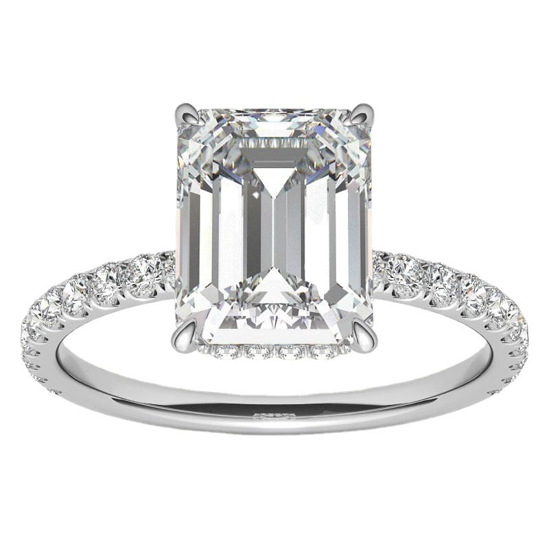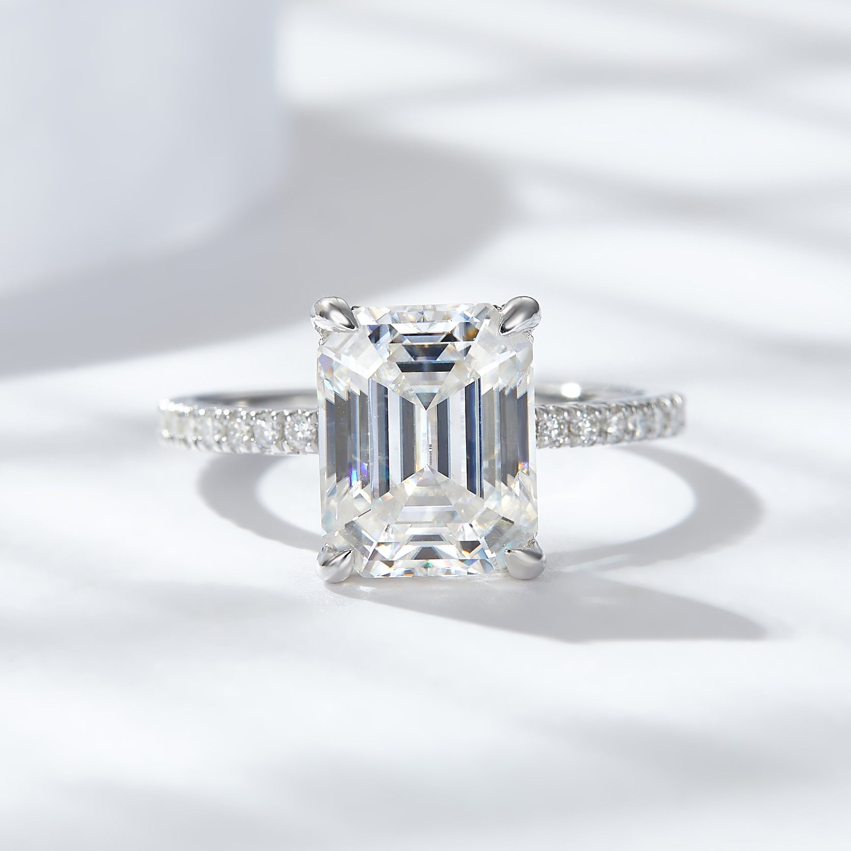 The emerald-cut moissanite and shimmering zircon accents are set in a timeless design, perfect for engagements, weddings, anniversaries, or adding a luxurious touch to daily wear.