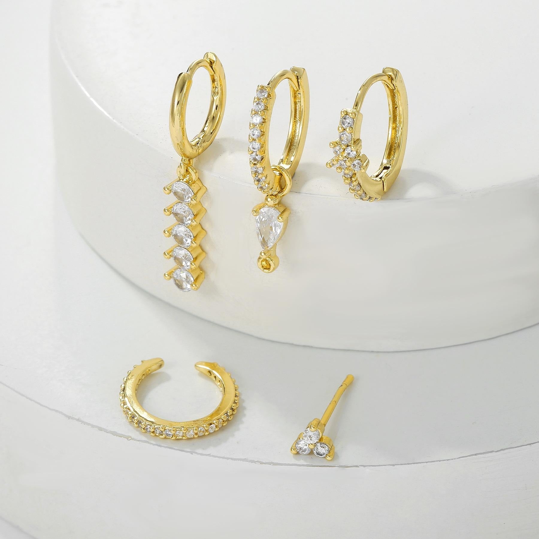 - Set Includes: 5 Individual Pieces (1 Stud, 3 Hoops with Drops, 1 Ear Cuff)