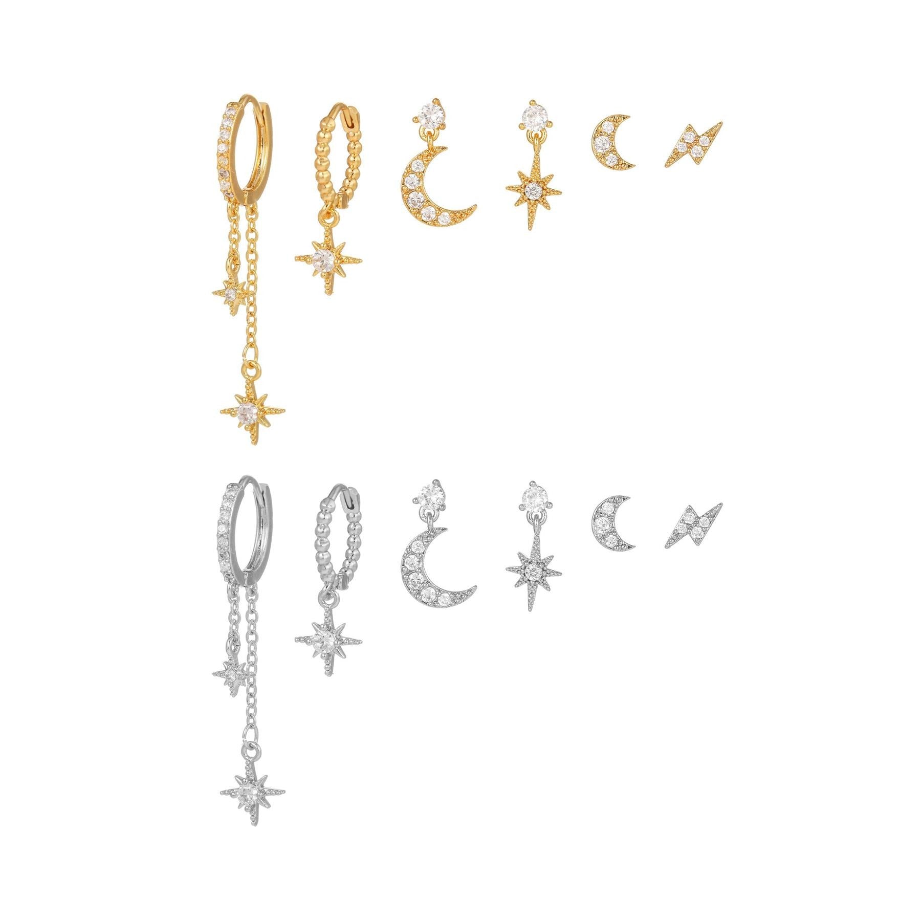 6pcs Celestial Star Moon Earrings Set, S925 Silver Posts, 18K Gold & White Gold Stud Drop Hoop, Stacked Lobe CZ Jewelry Gift Cubic Zirconia