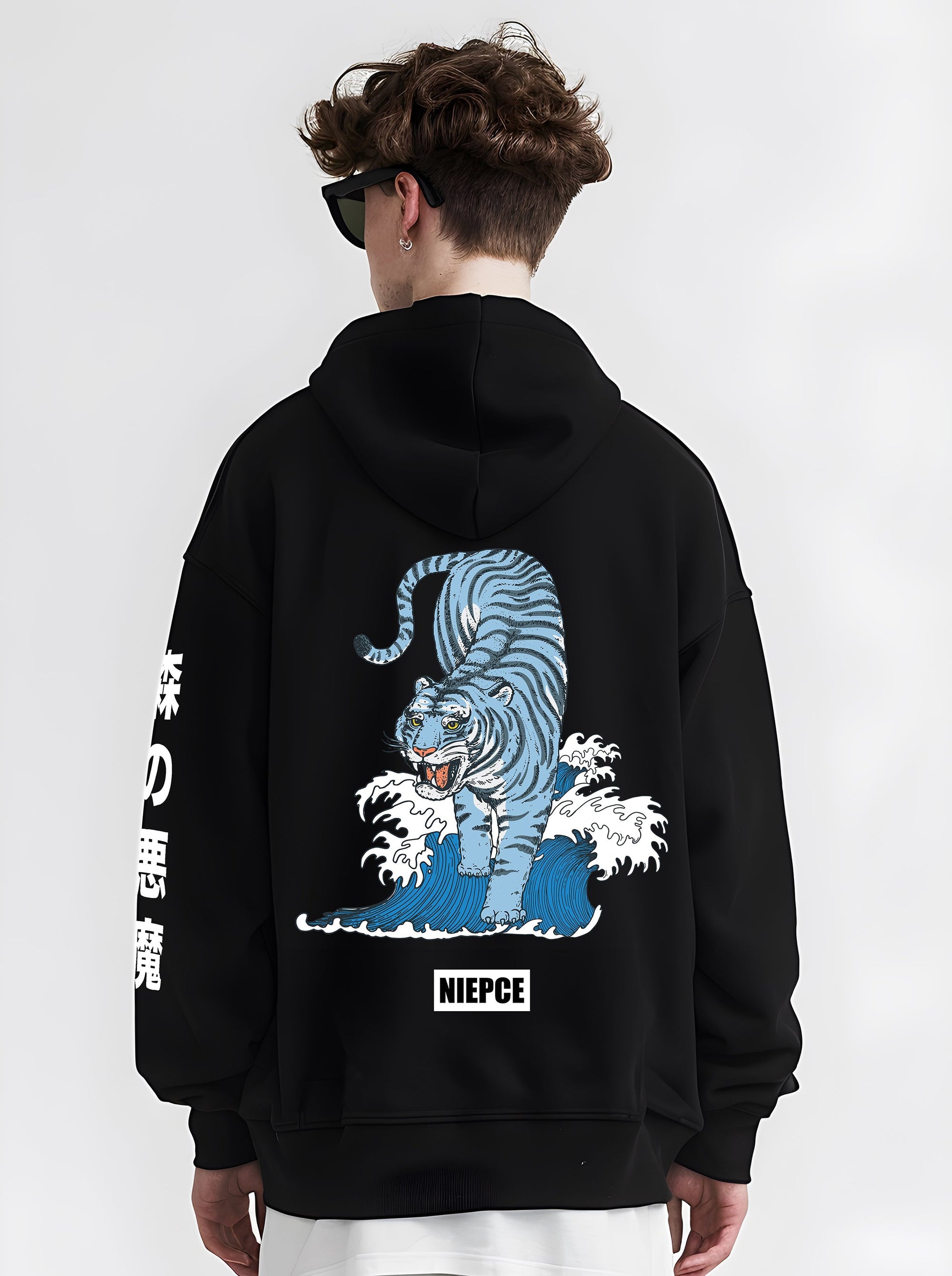 - Back side features a a blue tiger in great waves design with a box logo Niepce graphic on the bottom