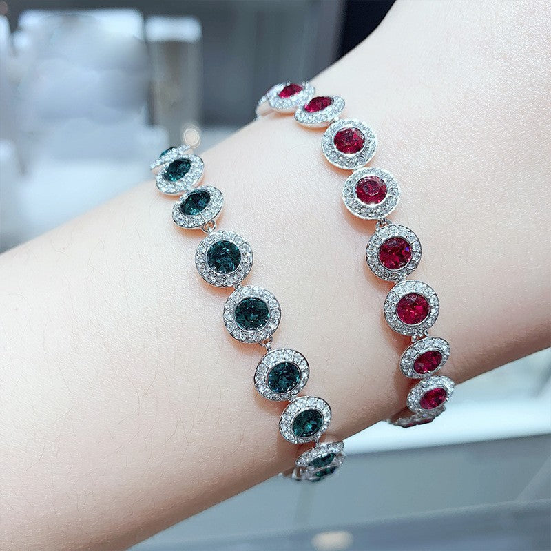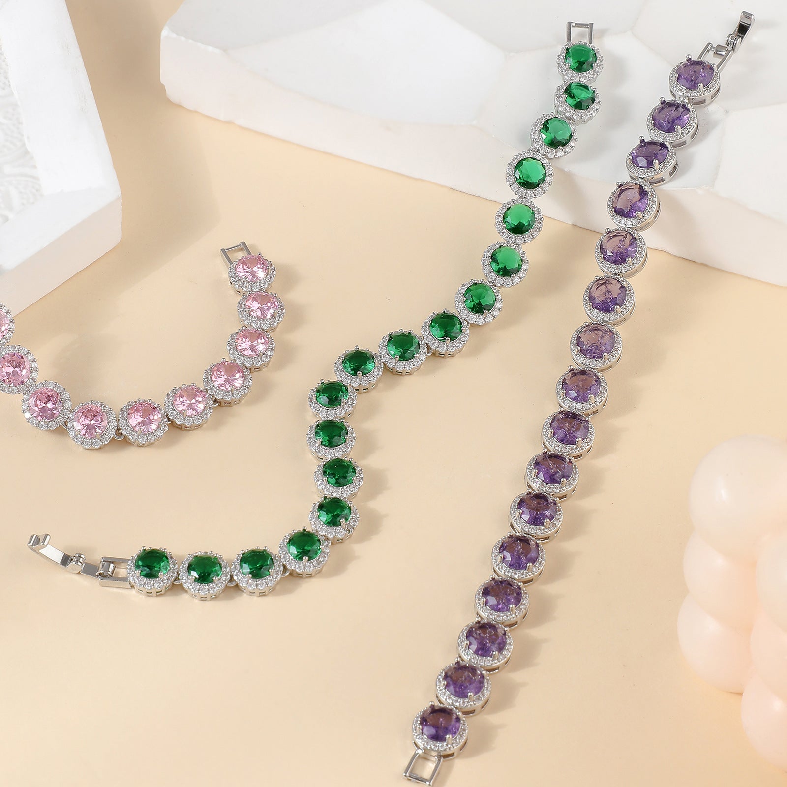 This dazzling bracelet features a series of round-cut cubic zirconia stones in vivid hues, each surrounded by a shimmering halo pavé setting. The symmetrical layout and bold colors make this piece a show-stopper—ideal for special occasions or elevating your daily look.