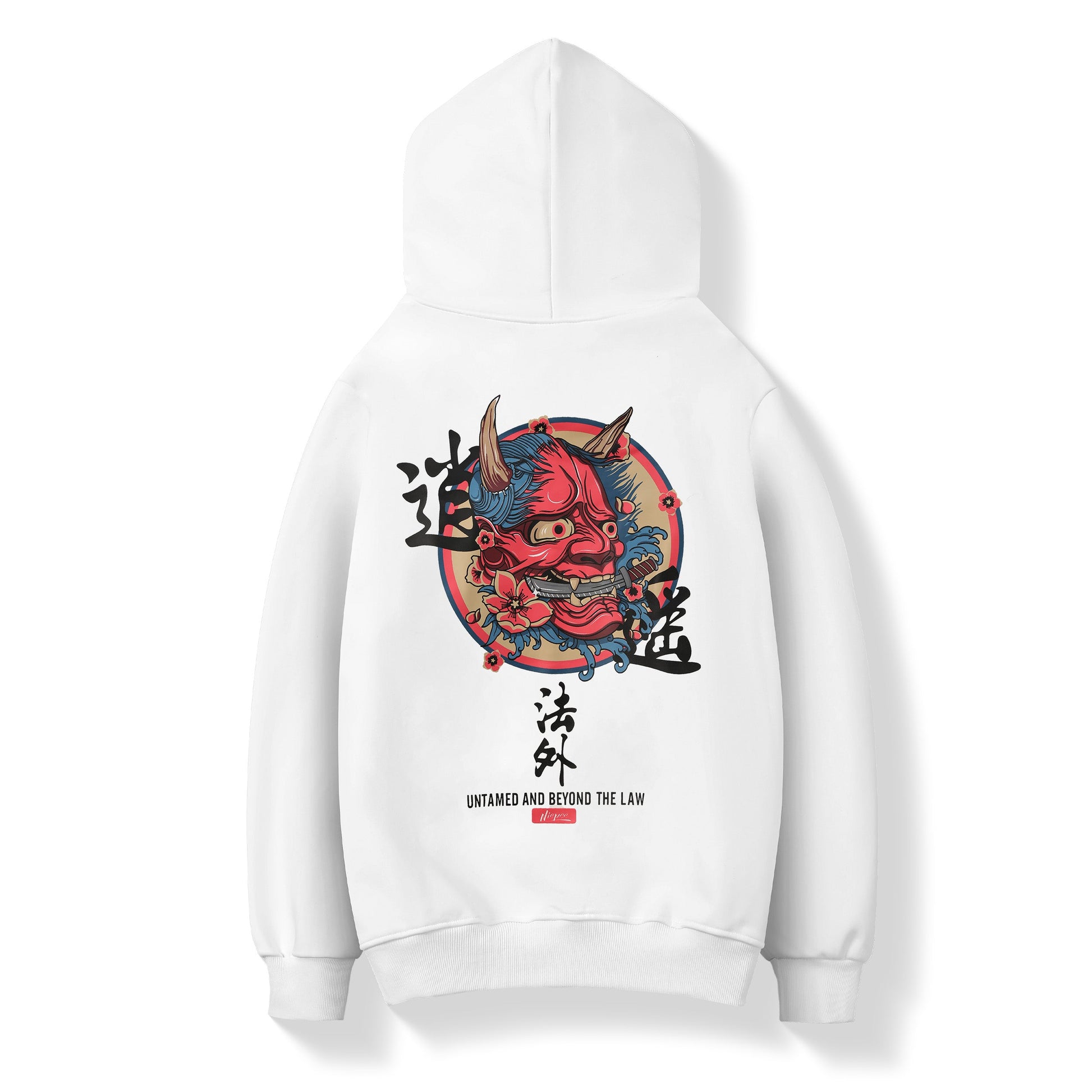 - The hoodie features a Japanese painting of a demon biting a knife in the mouth. "Untamed and Beyond the Law" written in Japanese kanji on front and back of the hoodie.